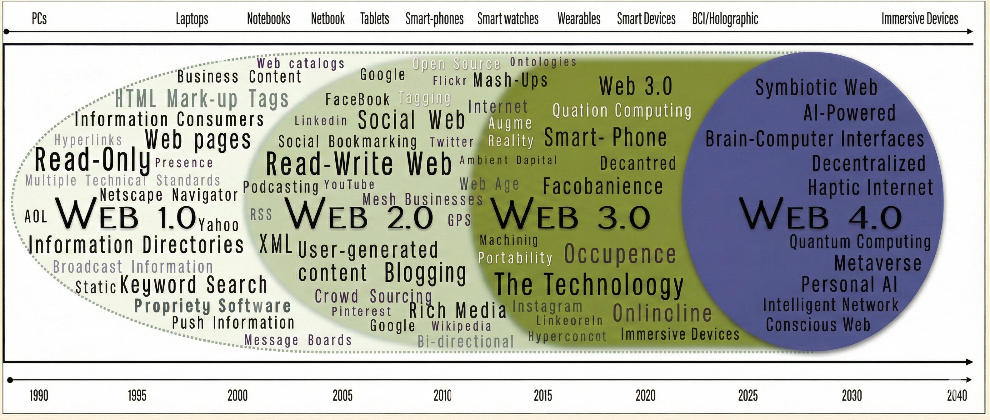 | Web 4.0 | Intent and context | Multi-modal sensors, LLMs | Ethics, real-time processing |