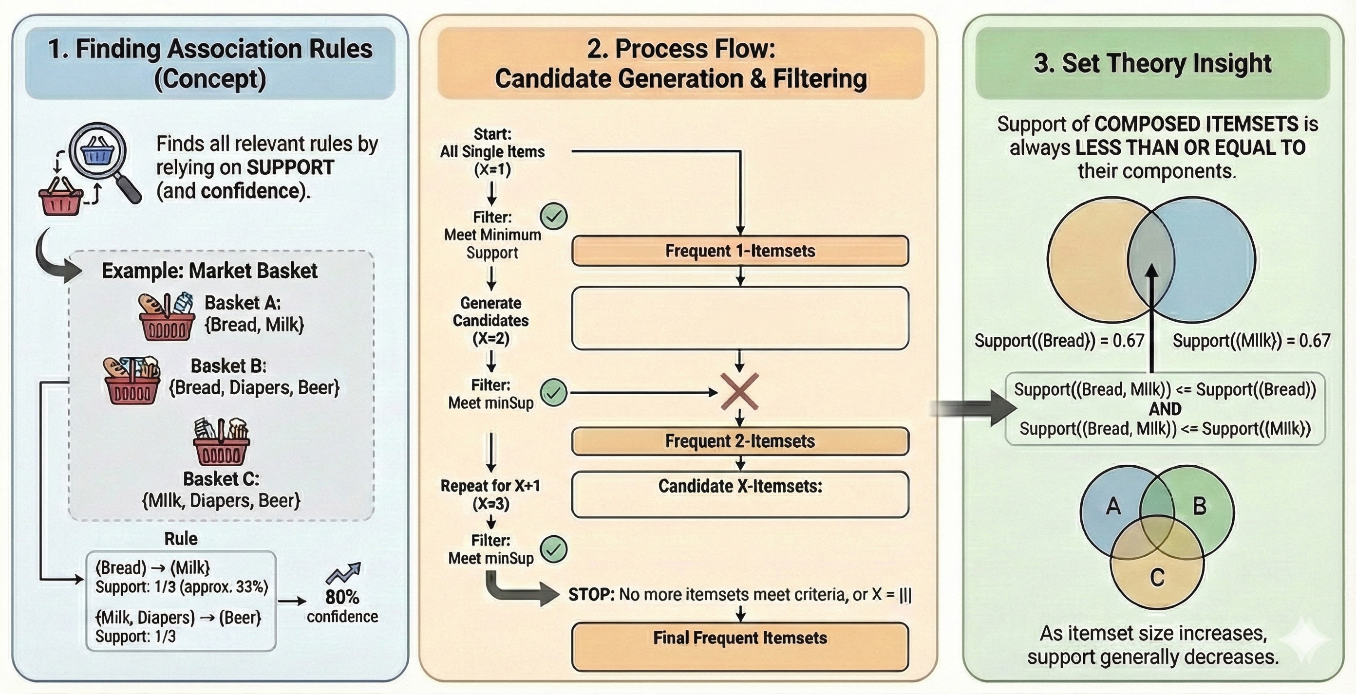 Confidence: The number of times both itemsets occur together given the occurrence of \(A\). \[ conf(A \rightarrow B) = \frac{sup(A \cap B)}{sup(A)} \]