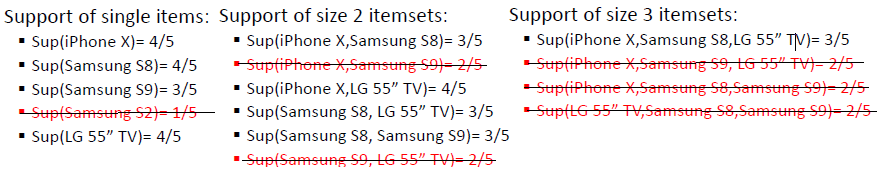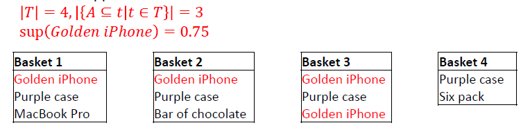 Support: The number of times \(A\) appears among the transactions. \[ sup(A) = \frac{|\{A \subseteq t | t \in T\}|}{|T|} \]