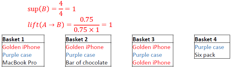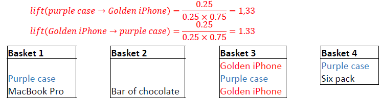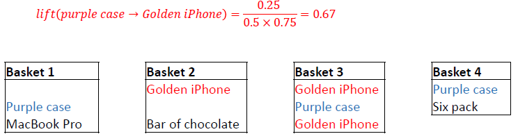 Example: Calculate the lift of Golden iPhone \(\rightarrow\) Purple Case.